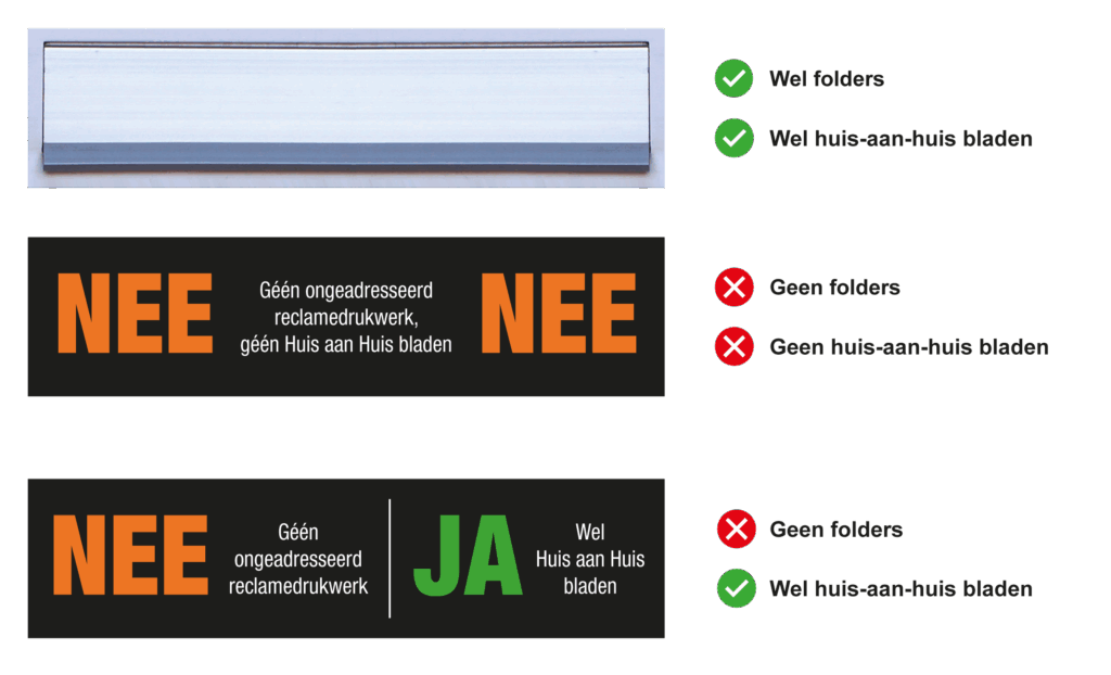 Onderstaande stickers kom je tegen in gemeenten waar de JA-JA sticker van kracht is.